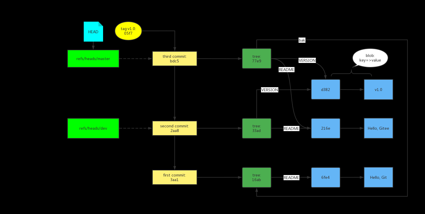 我们可以借助 git-draw 工具生成一张图来说明此时的仓库各个数据之间的关系: