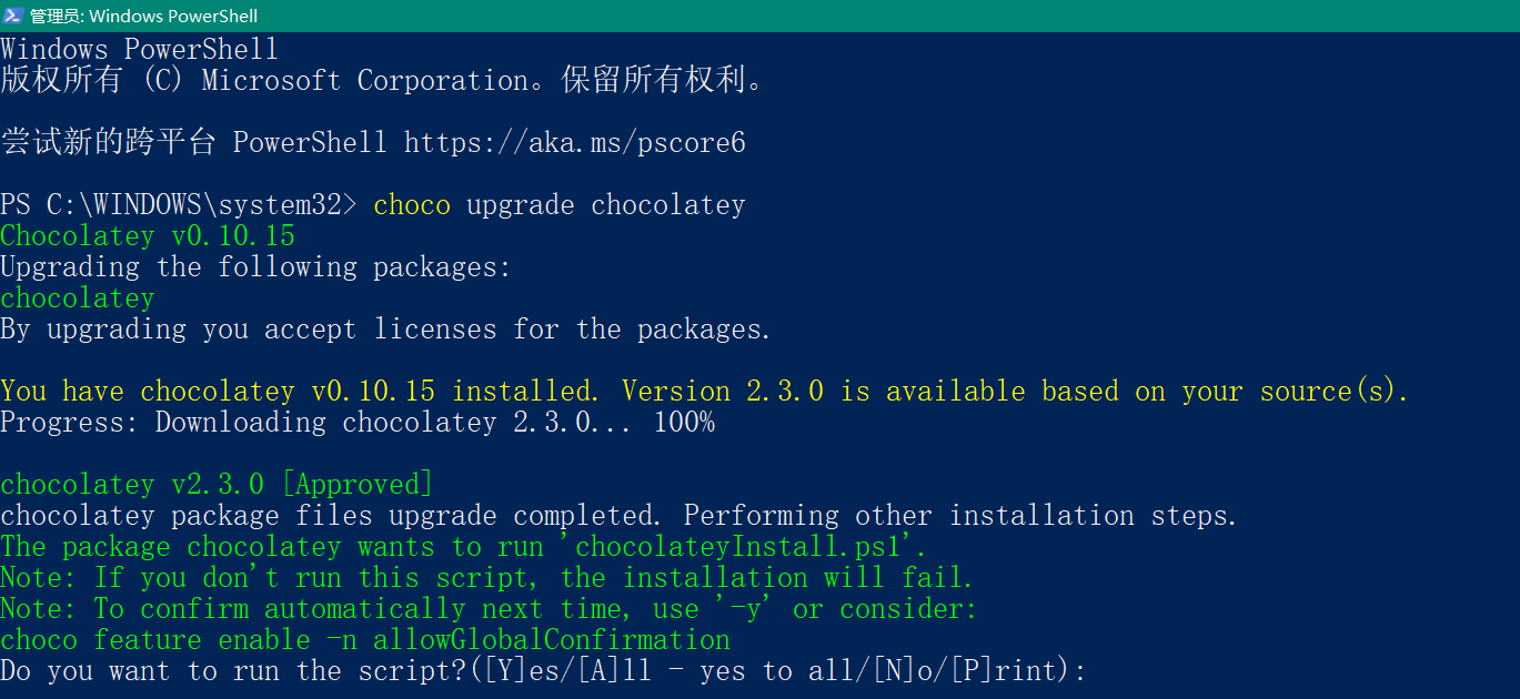 一般默认内置的 Chocolatey 大概率不是最新版本,所以就需要先升级,升级也很简单,输入命令如下: