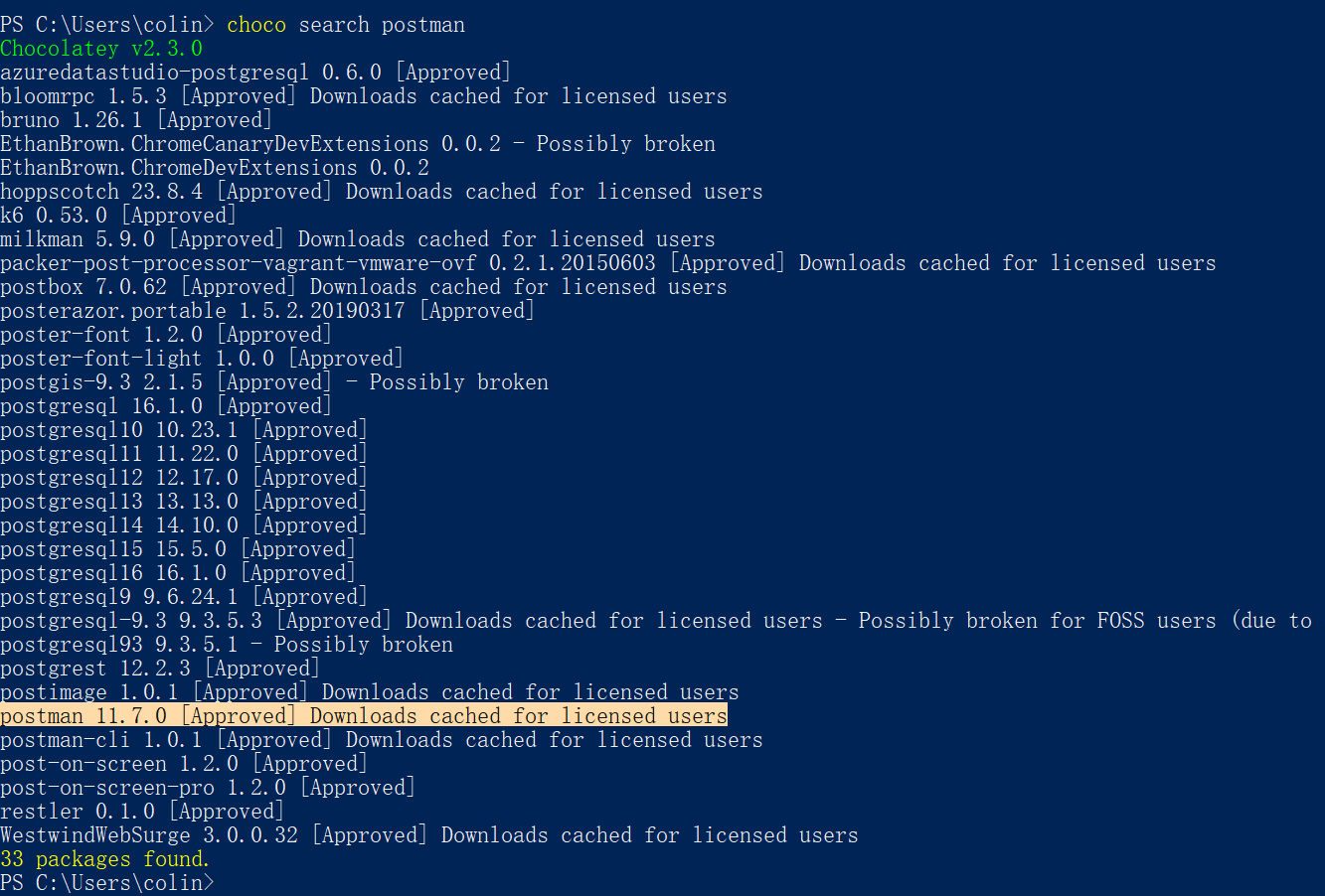 choco install postman --version 11.7.0 -y prefix:Powershell如果不确定官网有没有这个软件,或者有没有某个版本,可以进行搜索: